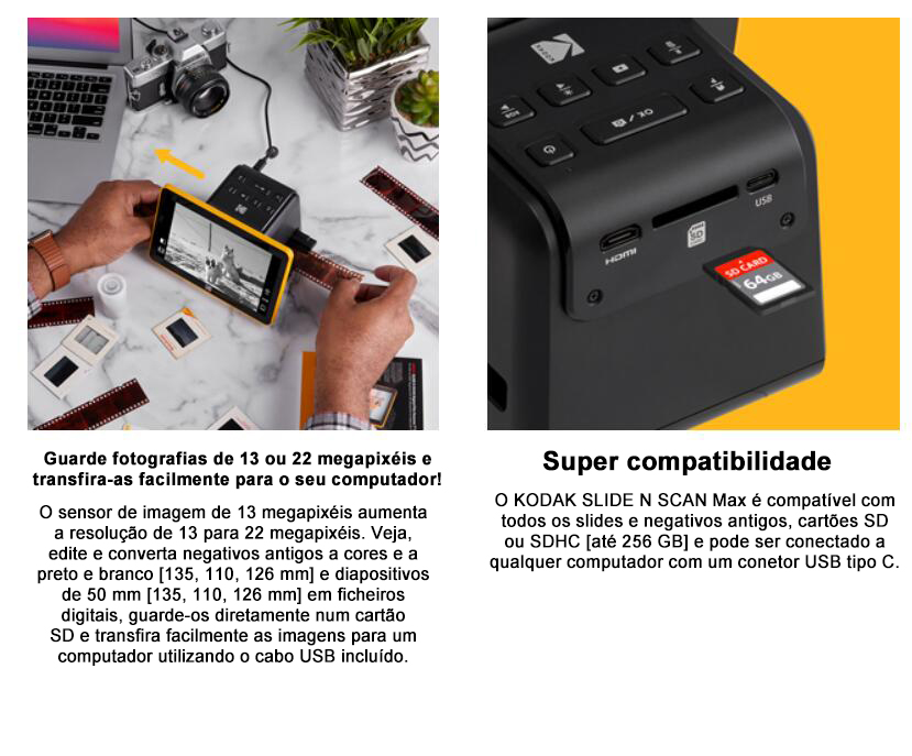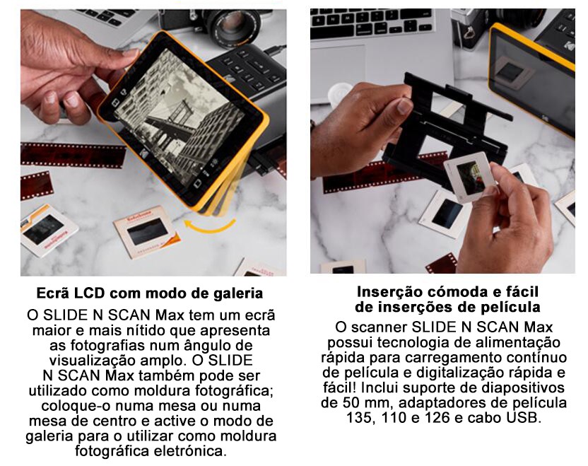 O KODAK SLIDE N SCAN Max produz imagens nítidas e equilibradas. É a resolução ideal para negativos e diapositivos a cores ou a preto e branco.