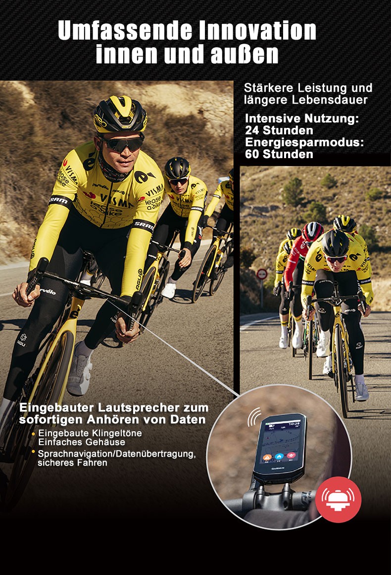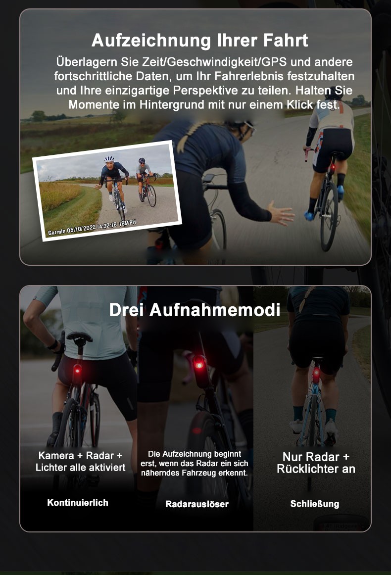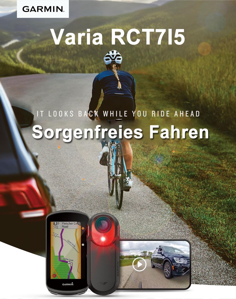 Edge 1050 und Varia RCT715 können Funktionen wie Echtzeiterkennung und -warnung vor rückwärtigen Fahrzeugen, intelligente Warnung vor gefährlichen Straßen und automatische Speicherung von Fahrvideos realisieren.