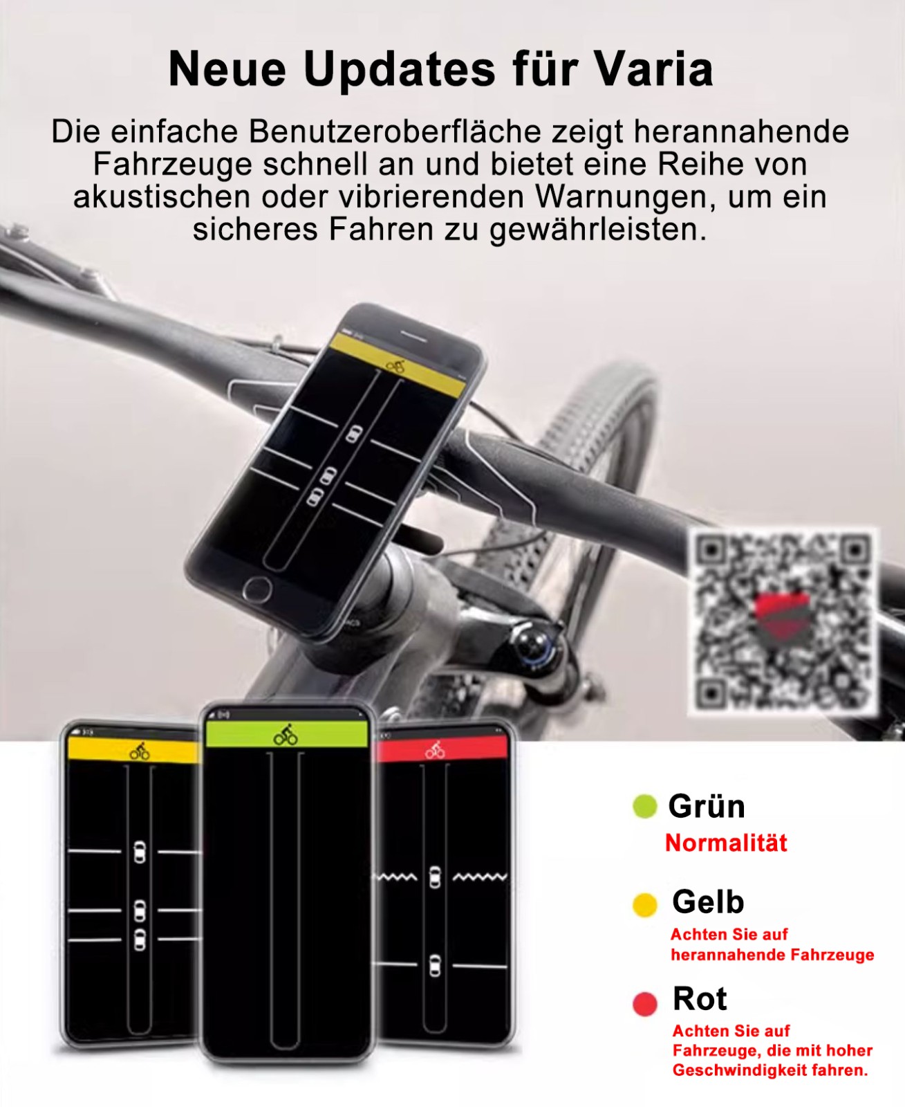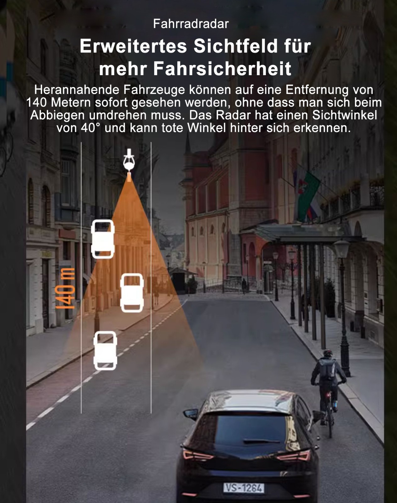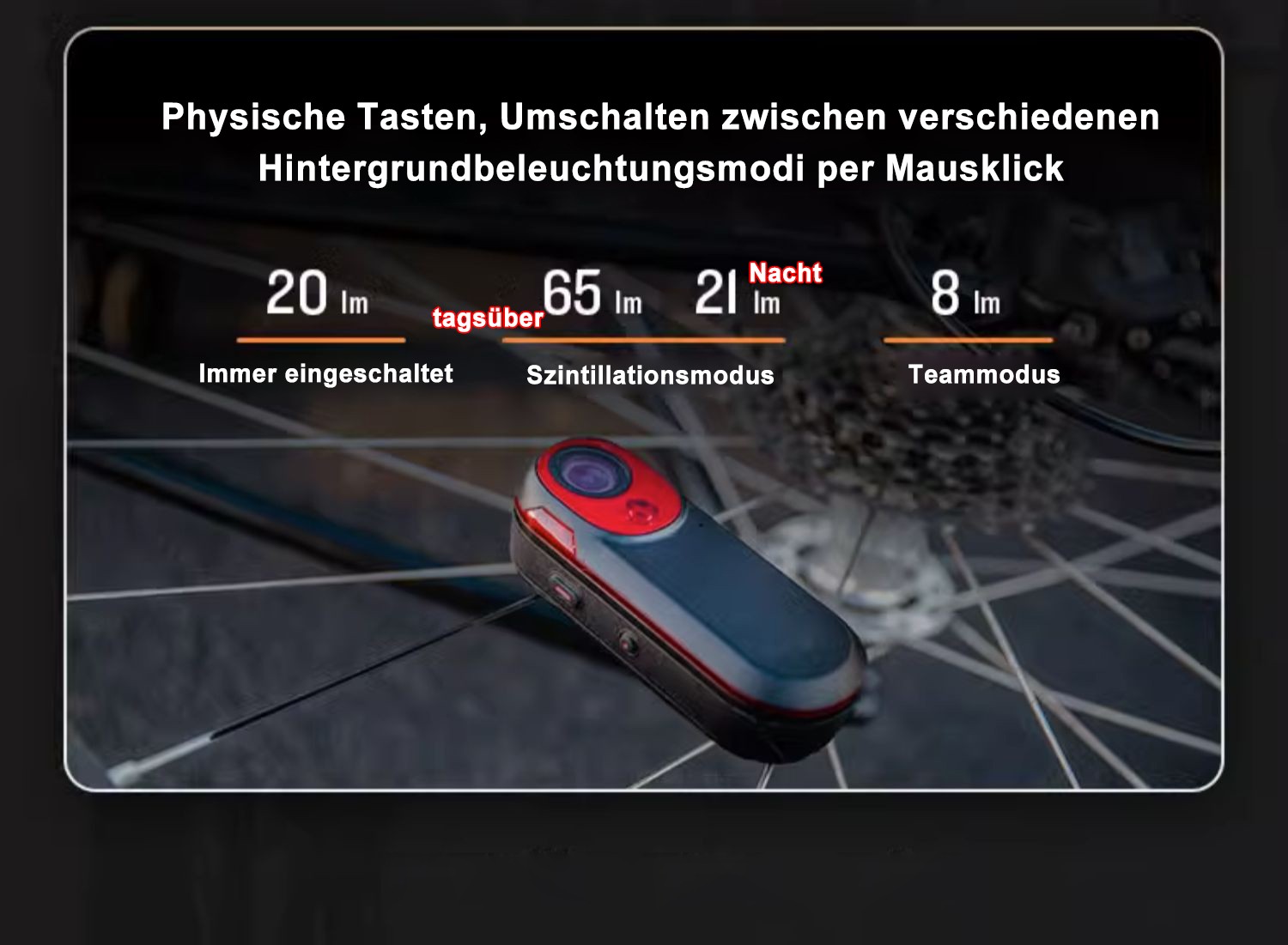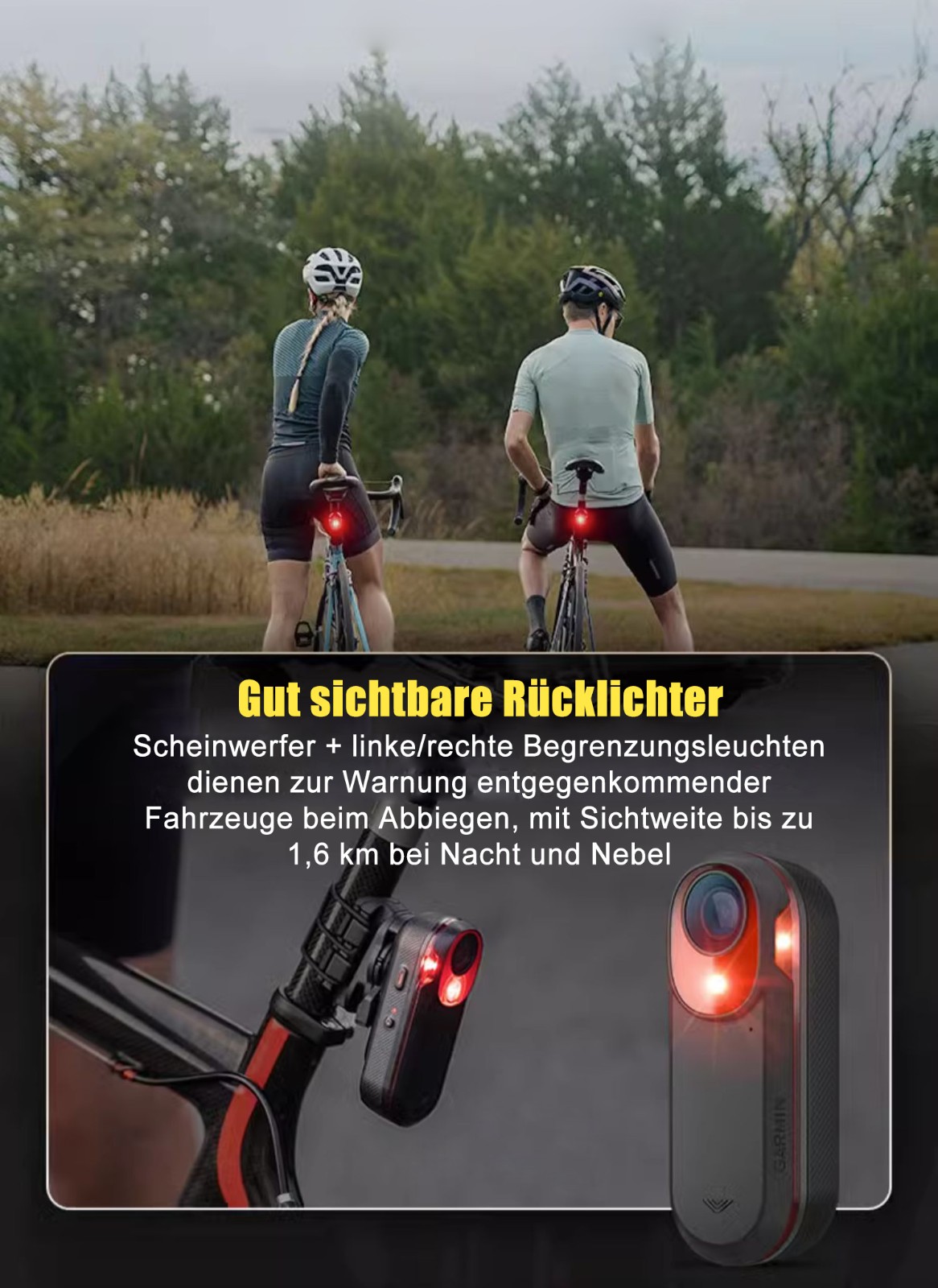 Rücklicht-Warnfunktion: Passt die Helligkeit automatisch an das Umgebungslicht an, um die Sichtbarkeit bei Tag zu verbessern
