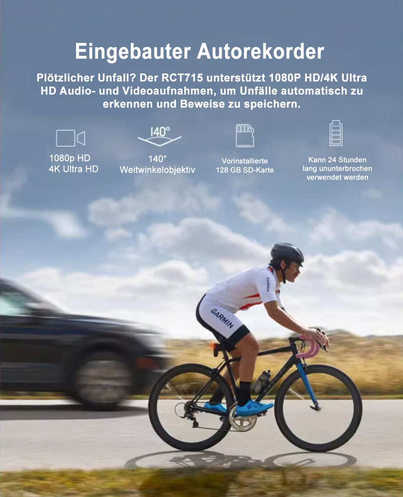 Integrierte HD-Kamera (Full HD 1080p): Nimmt automatisch Bilder der Rückansicht auf, um im Falle einer Kollision Beweise zu sammeln