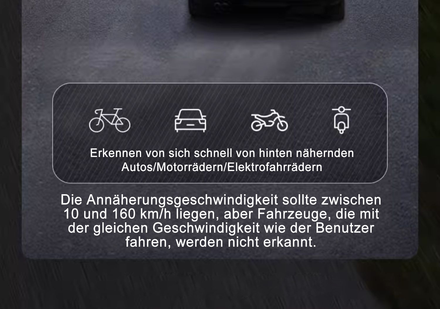 Optische + akustische Warnung: macht Sie darauf aufmerksam, wenn sich ein Fahrzeug von hinten nähert